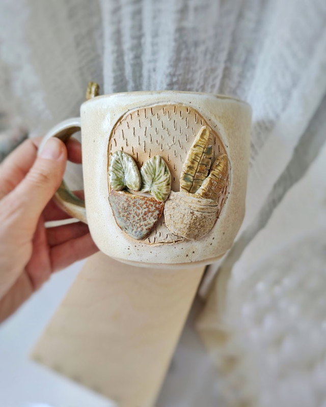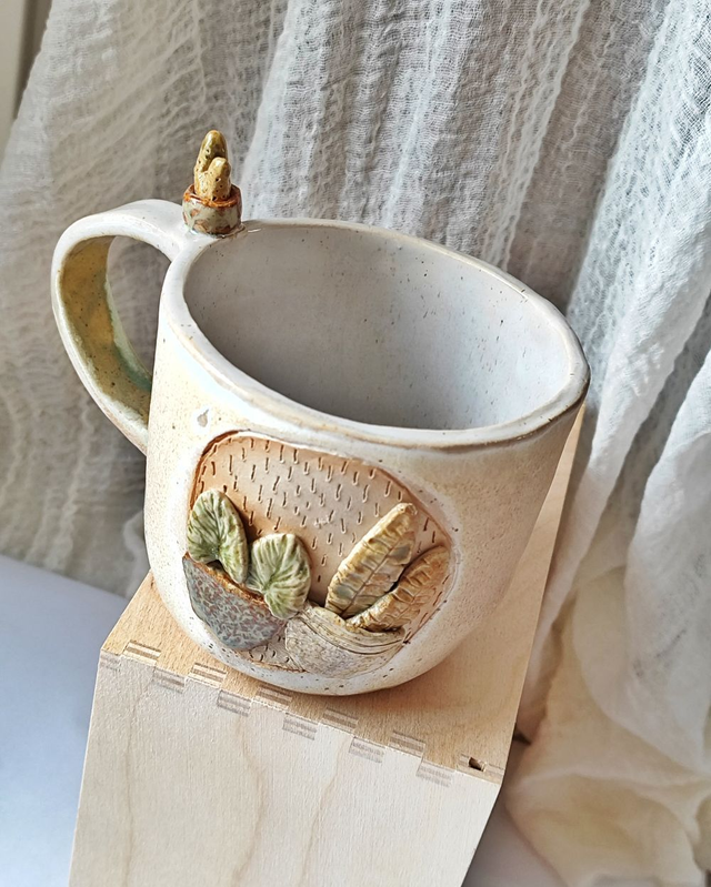 Beżowo-kremowy kubek z delikatnym szkliwieniem i płaskorzeźbami roślin. Na uszku siedzi maleńki kaktusik, nadający naczyniu charakter i odrobinę humoru.