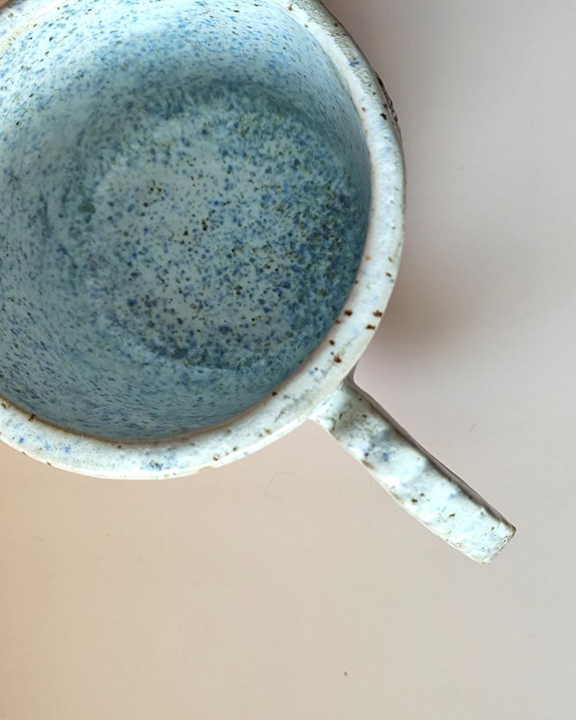 Kubek jest trwały, odpowiedni do zmywarki, a spód pozostaje naturalny i nieszkliwiony.