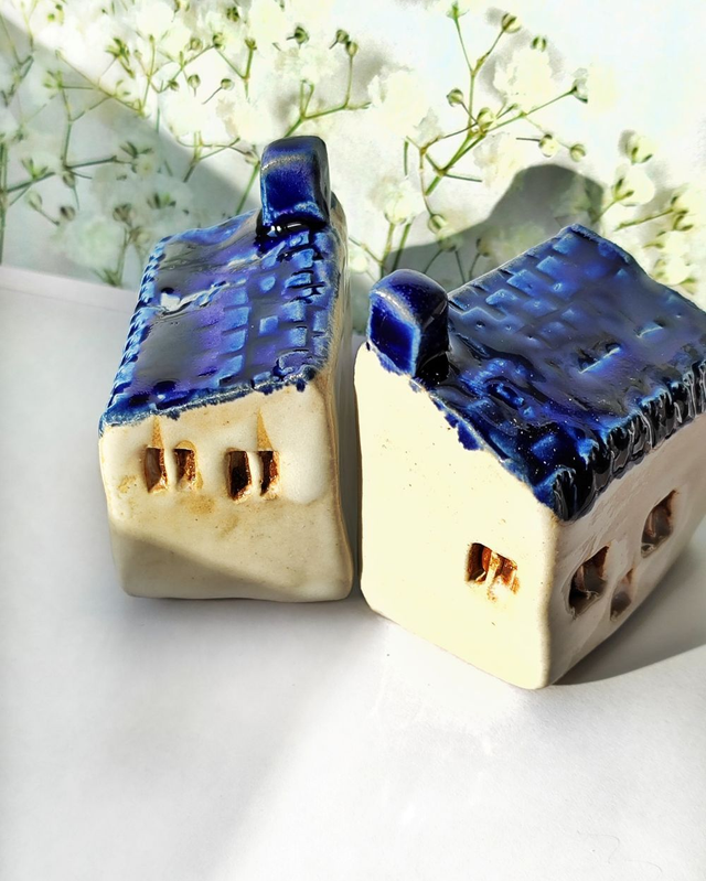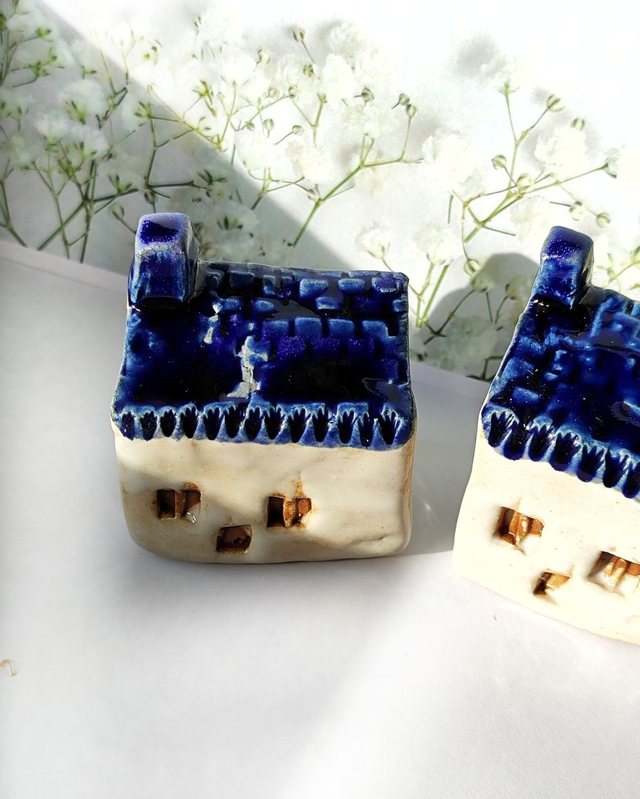 Mały domek ceramiczny o jasnych ścianach i intensywnie kobaltowym dachu. Prosta bryła nawiązuje do zabudowy śródziemnomorskiej.