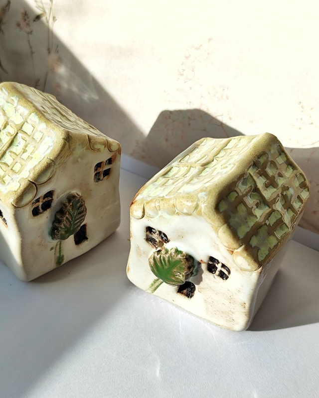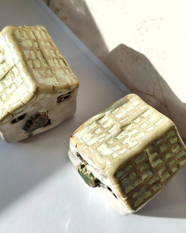 Mały domek ceramiczny z jasnymi, beżowymi ścianami i żółtym dachem o fakturze dachówek. Z przodu wyrasta miniaturowe drzewko uformowane z gliny. Wykonany ręcznie, z lekką nieregularnością linii.