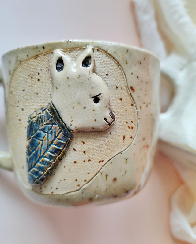 Kubek z chihuahuą to propozycja dla fanów tej słodkiej i charakternej rasy. Na szkliwie w beżowych odcieniach znajduje się wypukły piesek chihuahua w sweterku. Kubek jest ręcznie robiony i nie jest idealnie okrągły, posiada krzywizny które dodają mu charakteru.