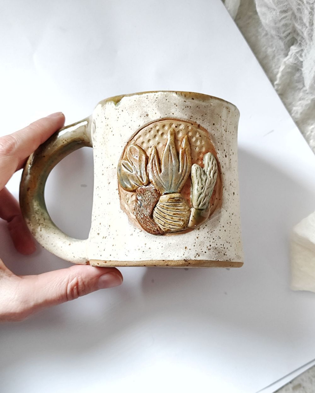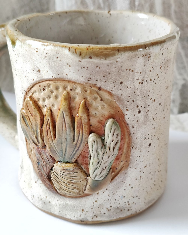 Pojemny kubek o prostym kształcie, z dużym, wygodnym uchem. Z zewnątrz pokryty beżowym, nakrapianym szkliwem o satynowym wykończeniu. Na froncie znajduje się mała płaskorzeźba rośliny w doniczce.