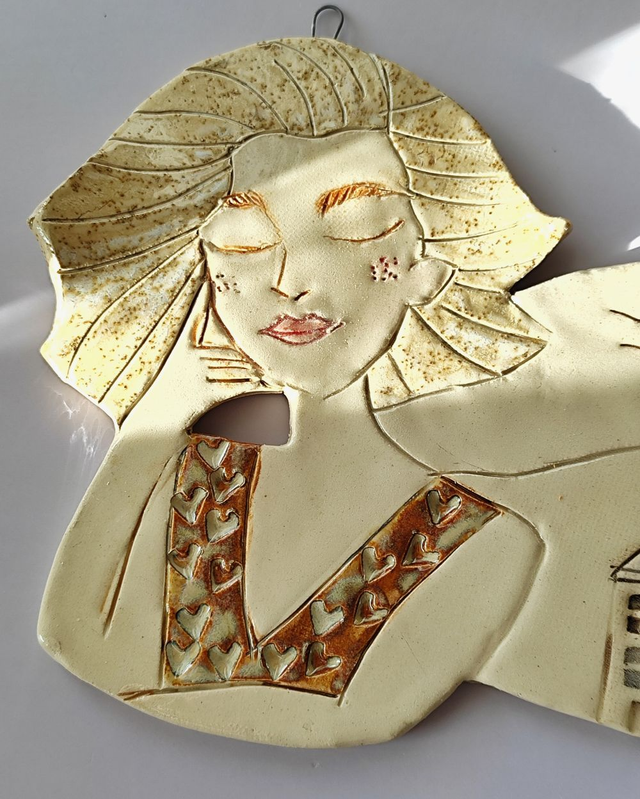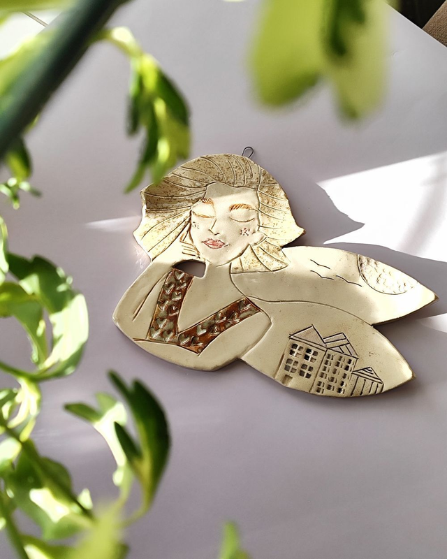 Jasno-beżowy anioł ceramiczny z delikatnym motywem domków na skrzydłach. Dekoracja ścienna o spokojnym, ciepłym charakterze, która dobrze odnajdzie się w domowych wnętrzach — w salonie, sypialni lub przedpokoju.
