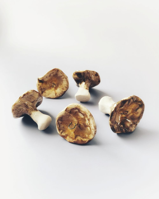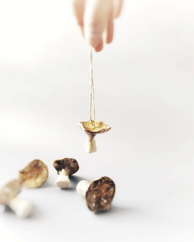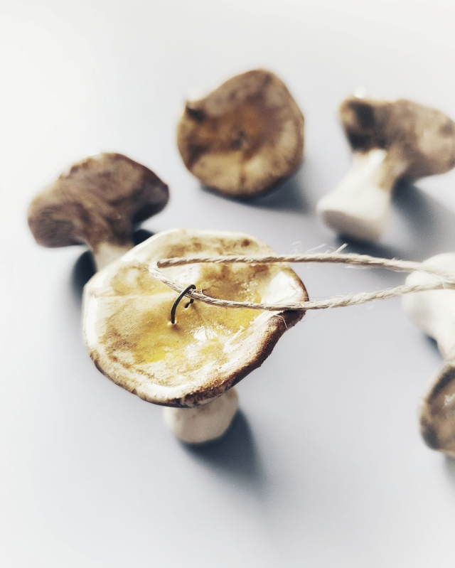 Grzybki inspirowane barwami lasu i jesiennymi spacerami. Każdy egzemplarz jest wykonany ręcznie, dzięki czemu różnią się detalami i fakturą szkliwa – tak jak w naturze nie ma dwóch identycznych grzybów Zawieszki ze sznurka pozwalają zawiesić je na choince, gałązce lub wieńcu.