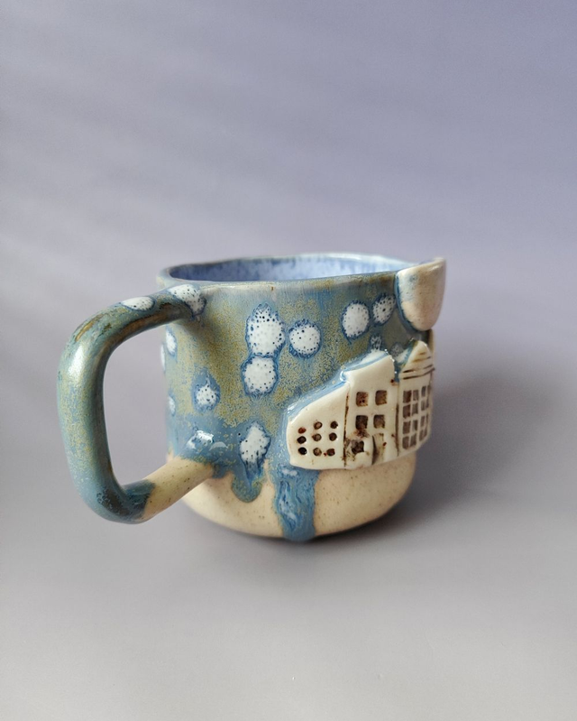 Na kubku przycupnęło małe osiedle białych domków. Całość na tle szaro-niebieskiego, nakrapianego nieba pod księżycem.