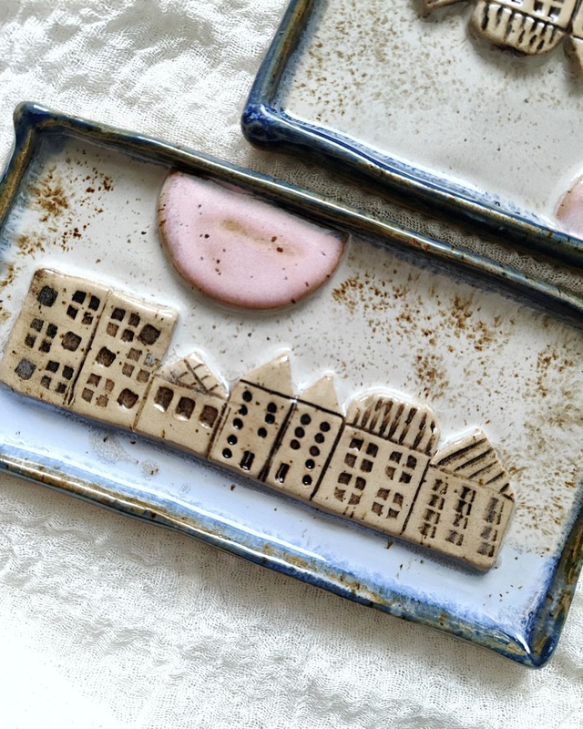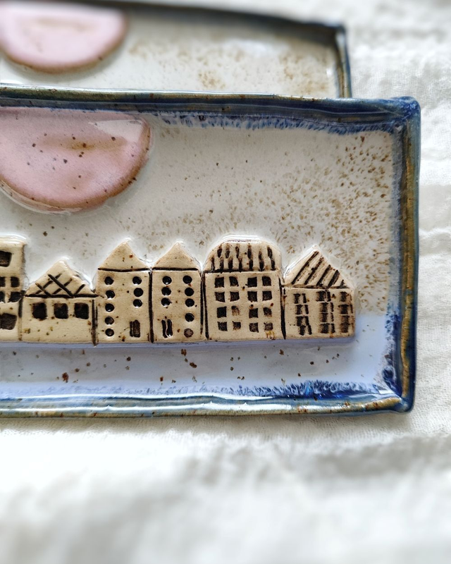 w formie miniaturowego miasteczka, idealny jako dekoracja stołu. Każda podstawka jest ręcznie wykonana, szkliwiona w delikatnych odcieniach bieli, różu i błękitu, z subtelnym efektem rustykalnym.