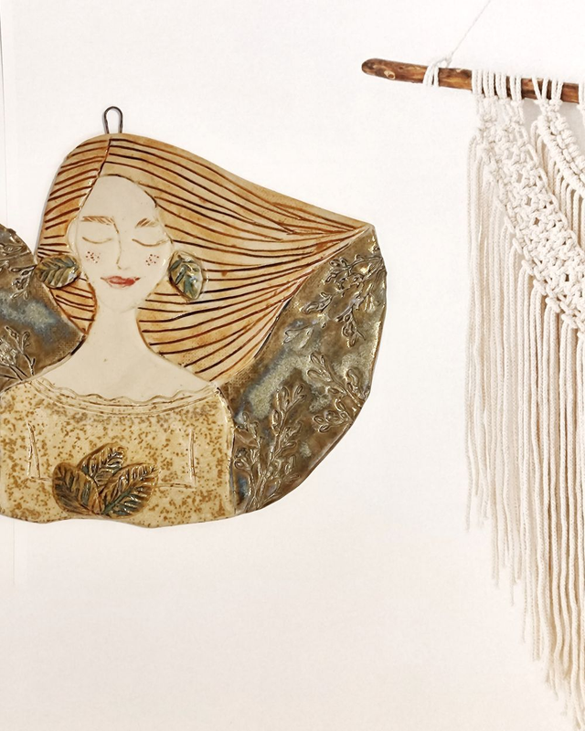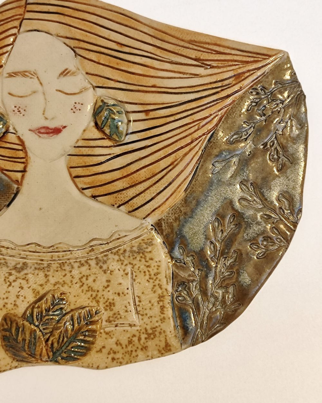 Leśna wróżka z liśćmi to ceramiczna dekoracja ścienna, w której główną rolę gra faktura i rytm natury - skrzydła wytłaczane są w roślinny wzór, który wypełniło szaro-niebieskie szkliwo. Wróżka trzyma w dłoniach pęk liści.