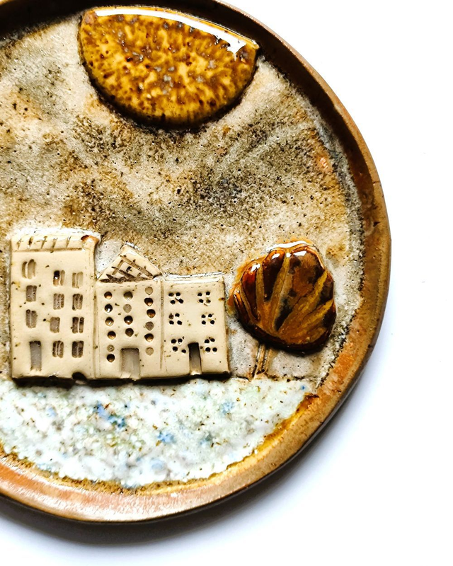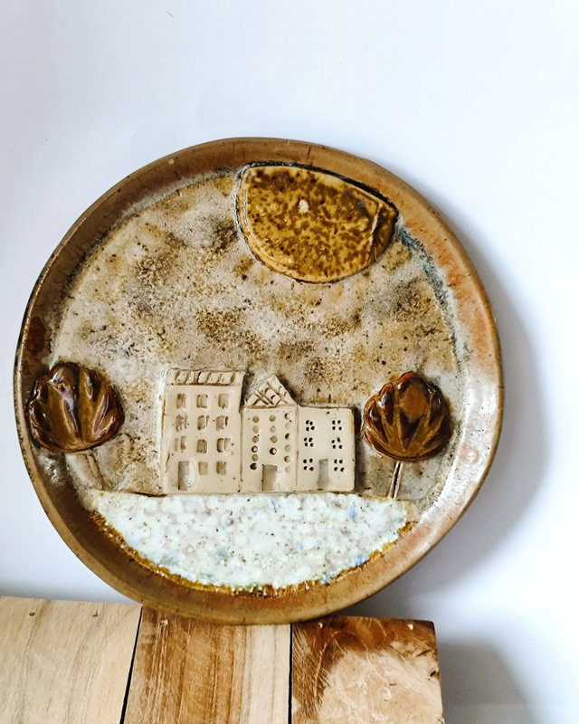 Każdy talerzyk jest lepiony ręcznie, dlatego różni się detalami – to część uroku ceramiki rzemieślniczej. Kolory są stonowane: beże, brązy, ciepłe żółcie i odrobina czerwieni.