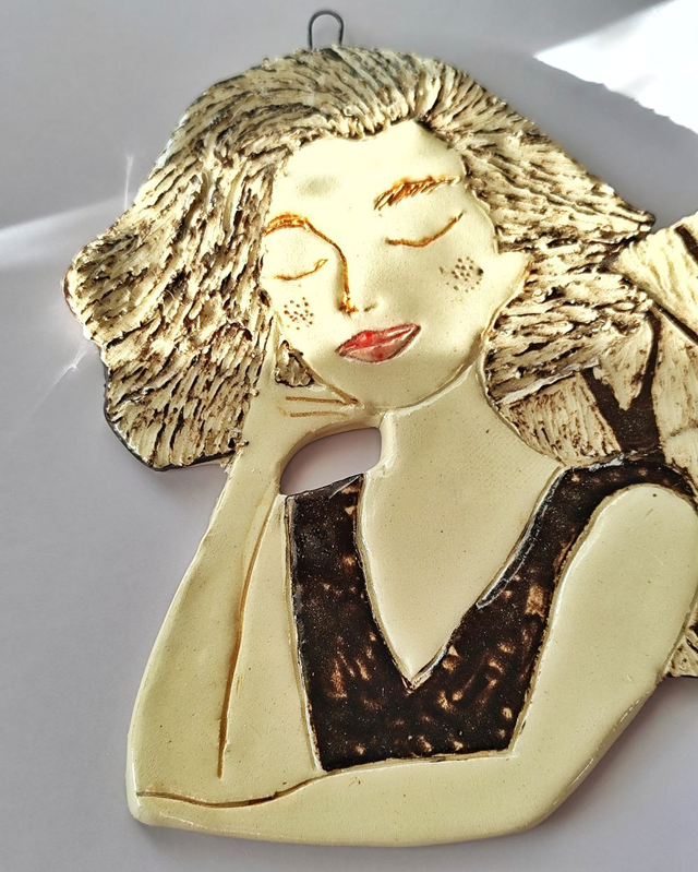 Czarno-biała ceramiczna wróżka inspirowana lasem i naturą. Skrzydła zdobione motywem drzew wykonanym w technice sgraffito, czyli ręcznego wydrapywania wzoru w glinie. Każda linia powstaje ręcznie, dlatego dekoracja ma graficzny, surowy charakter i jest unikatowa.