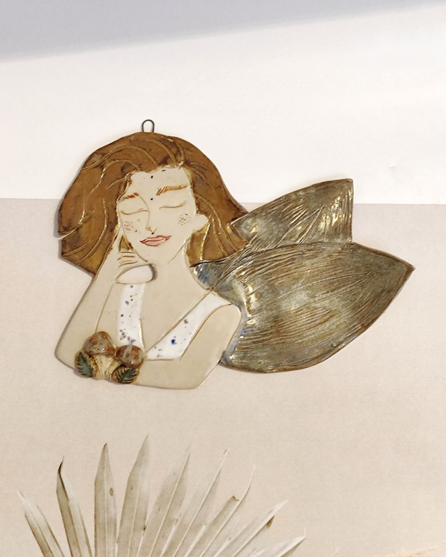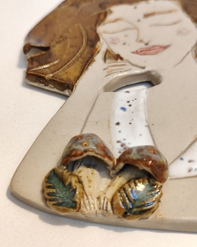 Ceramiczna wróżka z motywem grzybów to dekoracja inspirowana lasem i światem przyrody. Spokojna, zamyślona twarz, delikatne rysy i naturalna kolorystyka przywołują skojarzenia z ciszą leśnych ścieżek i wilgotnym mchem.