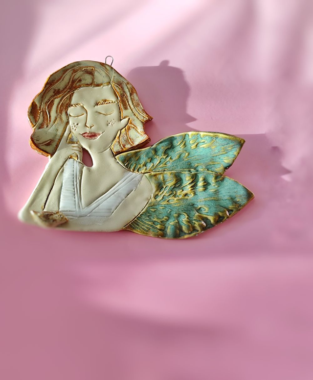 Ceramiczna wróżka z zielonymi skrzydłami i małym ptaszkiem to dekoracja inspirowana naturą i spokojem. Delikatna forma, ręcznie wykonane detale i stonowana kolorystyka sprawiają, że ozdoba dobrze pasuje do jasnych, naturalnych wnętrz