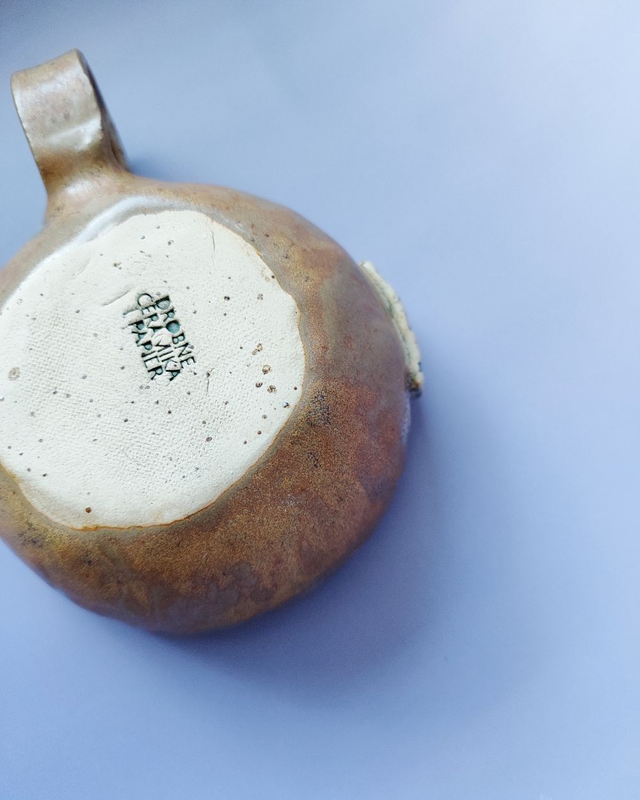 Spód filiżanki nie jest szkliwiony - to surowa, nakrapiana glina. Spód może posiadać drobne nierówności, co nie jest podstawą reklamacji.