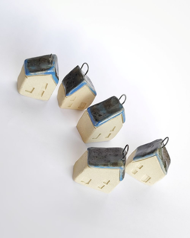 Zestaw mikro domków ceramicznych niebiesko-szarych – zawieszki na choinkę