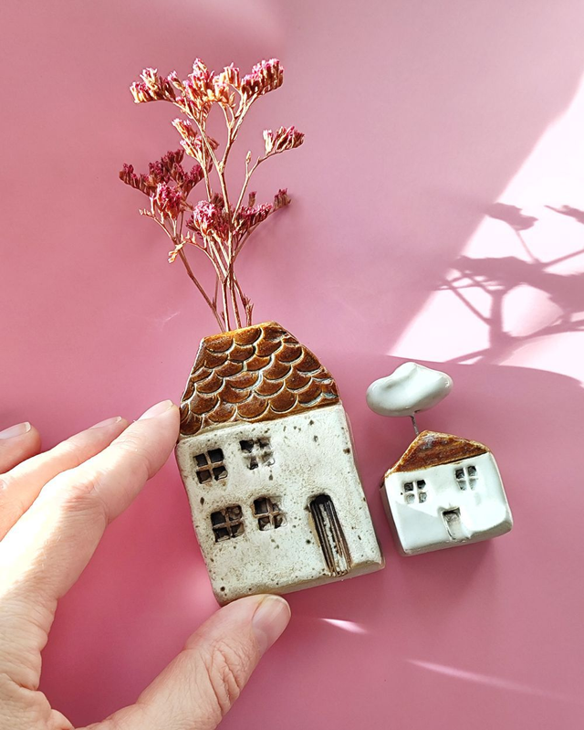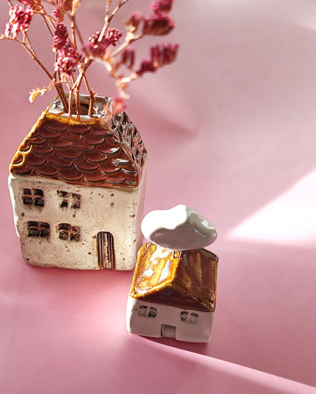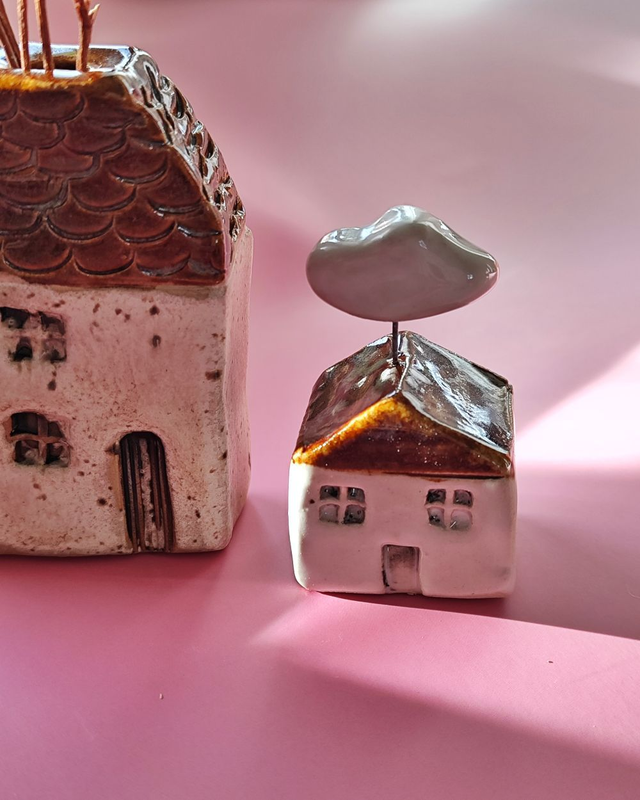Zestaw składa się z dwóch ręcznie wykonanych ceramicznych domków: większego domku z otworem w daszku na suszone kwiaty oraz mniejszego domku z chmurką umieszczoną na druciku. Większy domek posiada brązowy dach z widocznymi dachówkami, beżowe nakrapiane ściany oraz czarne okienka i drzwi. Mniejszy domek stanowi lekkie, dekoracyjne uzupełnienie całości.